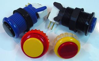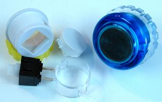 Buttons also come in a large variety of colors. If desired, plungers can be interchanged in buttons for different mixes (usually the same model has to be involved). Seimitsu offers buttons with clear caps so images can be inserted like under acrylic glass (insert some of the pieces left over from cutting through the background for continuity; trace the background under the top panel, then trace the plunger head before cutting; do the larger button hole cutting with a knife, then the small button faces with scissors). Also, using clear tops and buttons and a hollowed shaft and LEDs, illuminated tops and buttons can be made.