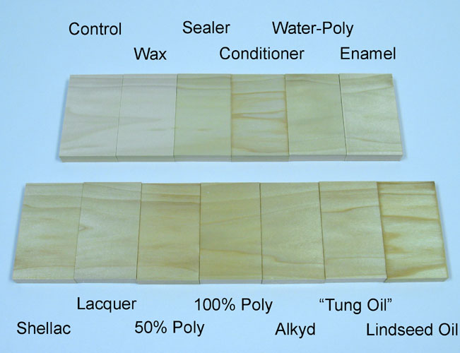 Oil: In finishing, special oils that cure can be used. These oils include lindseed, tung, and some synthesized oils; do not use oils as finishes besides these ones because they will not cure and just remain wet or evaporate. The curing process of these oils can take months; to help with make this faster, oils are often boiled to partially cure them (the most popular being boiled lindseed oil), reducing months down to about a week or two. Many products sold as finishing oils are often just eleborate versions of rubbing varnish, and most products sold as finishing oils contain at least a bit of varnish. Cured oil is only slightly more durable than wax, and very weak compared to other finishes. It leaves a strong amber color. Sometimes oil is mixed with other finishes like varnish to make the grain stronger and warmer, though this lowers durability. Oil alone really does nothing more than make wood look warmer and wetter; my recommendation is not to bother with this overrated finish.