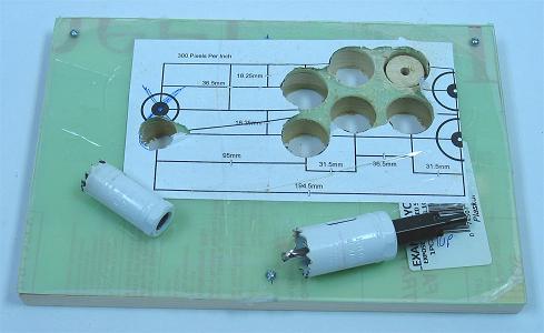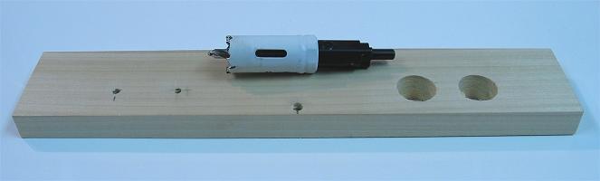 I transitioned to 1/4" to fit the cord and the arbor on the hole saw. With the board secured on a piece of scrap wood, I made each 24mm hole. Each took a while because my drill is not very strong and the hole saw and hole had to be cleaned of saw dust often. When the holes were done, I sanded each with some sandpaper on my fingertip to get them smooth and ready for routing.