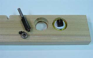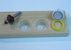 To make the face on the buttons look nice, and be sunk so they are not accidentally hit, I used a 3/16" beading bit (roundover bit with a 1/8" smaller bearing); this fit the faces of the buttons nicely. I then needed a groove for the buttons to fit on the back, and the beading bit is not big enough to fit the nuts. I could have delicately done this by hand, or done this well if I could find an appropriate rabbeting bit, but I decided to cheat a bit. I removed the bearing on a trim bit and used the attachment point as a guide instead; it was kind of sloppy and left some burning, but it worked. I again sanded it clean with paper on my fingertip.