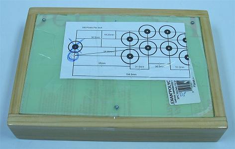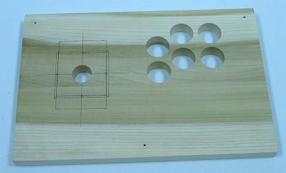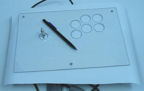 Using the clustered template I made and prefer, I printed out the design. I cut it smaller and positioned it on the box and panel until it suited a position I liked. I then taped it down and circled where I wanted the joystick. (I like the joystick near because I rest the side of my palm on the panel and the tip of my thumb on top of the joystick.)