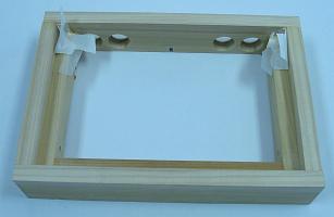 With the box done, it was time to center on the panels. Testing the fit of each acrylic panel on the box, each was a bit large. I had to take a lot of time to sand each panel with 60 grit sandpaper taped to a block of scrap wood. I made sure the film stayed on the glass and I did not sand the face. Once they had the proper dimensions, I could work on setting and installing the devices.