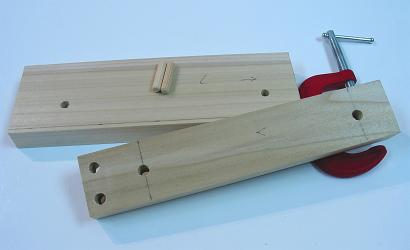 With the rough cuts made, I next set some of the attachments for dowels (you do not want to do them all at once because they may not fit well later on). First I set the connections for the three inner pieces (which are the main pieces for the box because the panel rests on them, and the feet attach on the bottom of them). I wanted to make sure they fit well together so I clamped the pieces to a board with a good right angle and drilled though the side pieces into the front piece.