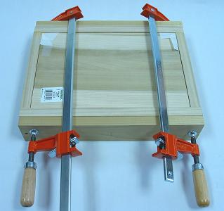 With everything in the box ready to come together, I got the pieces, glue, dowels, towels, paper, clamps, scrap wood, and a flat surface ready to put things together. Since I did not have many large clamps, I started with the front area only. I covered corners with paper on the main panel so things could be brought together evenly. I added a thin layer of glued everywhere things would touch and set the front and side pieces even together on a flat surface. Make very certain that things are set right because it cannot be unglued and you do not want a parallelogram or other bad shape. Be very ready, and maybe practice a bit without glue, before bringing things together.
