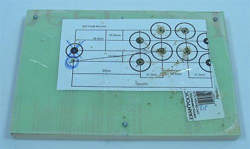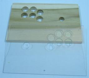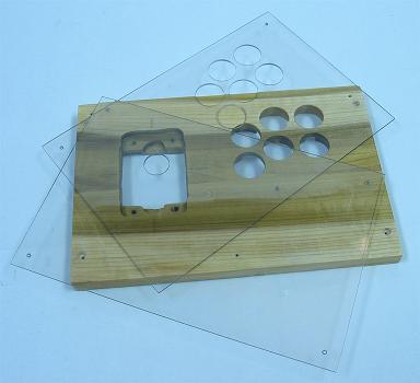 I clamped the panel securely and used a 24mm hole saw for the joystick and a 30mm hole saw for the buttons. Again, it took a while because the cuts had to be cleaned routinely. I then separated the two panels. I went around the edges that had been cut on the acrylic glass with my finger nail and the tip of a screwdriver carefully scraping stray plastic away. The top acrylic panel was then done and I could remove the protective film. I sanded the holes in the main panel clean using sandpaper on my fingertip.
