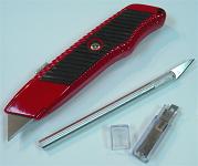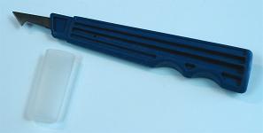 A utility knife holds a shaped razor blade. They are good for cutting paper for the background or separating solder connections on a PCB.