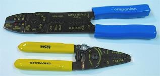 Images: Terminals left to right: female quick disconnect, butt connector, spade (fork) terminal, ring terminal; Wire cutter/strippers