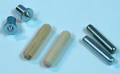 Dowels are solid cylinders usually made of wood, plastic, or metal used in interlocking two pieces with snug holes drilled for each end. They and the meeting pieces are usually all glued together. Their main advantage is leaving no sign of their use in the final product (like a screw hole). Dowel plugs can be used to smooth and hide holes (even for screws).