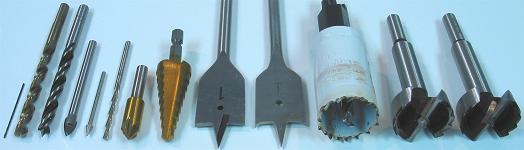 Image: Drill bits left to right: mini-twist, cobalt twist, brad-point, glass, diamond grinding, spiral, countersink, step, spade, spade (spurred), hole saw, forstner, forstner (spurred)