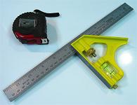Some enhanced measuring devices include the framing square and combination square. A framing square (also called a carpenter square) is an L-shaped ruler used for placing things at right angles. A combination square is a ruler with a sliding and locking right and 45-degree angle piece.