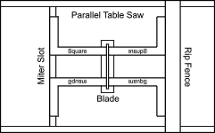 Table saws center on straight cuts. Pieces must be fed as straight as possible to prevent them from binding on the saw blade, the most noted side effect being kickback. Kickback throws the piece back since the blade moves in that direction. But kickback is just one of many problems from not feeding pieces straight, including jamming, uneven and crooked cuts, scuffmarks, and burning. To ensure quality and safe straight cuts, the rip fence and miter slot need to be aligned parallel to the blade. You will likely need a framing square and/or combination square for setting your saw properly. Pieces fed into a table saw should always be held against either the rip fence or the miter path, and never both.