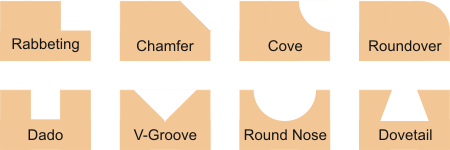 Router bits have blades or spirals that spin and do the cutting. There is a wide variety of router bits in many sizes. Special router bits make specialized shaping like roundover, chamfer, rabbeting, and dovetail possible. Store them safely so they do not bump and cause one another damage. The two most useful bits in controller building are a thin straight bit with a trimming wheel on the shank for general shaping and templating (often called a pattern bit), and a chamfer bit for general contouring and fitting; a trimming straight bit with the wheel on the tip is also useful.