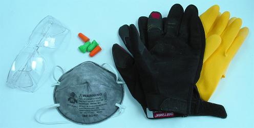 Image: Safety glasses, ear plugs, mask, and mechanic and rubber gloves