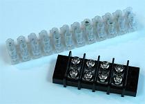 A terminal or barrier strip (also called a block) helps organize, secure, and duplicate or converge various signals from various wires. It uses screws to hold down wire ends (European-style) or spade or ring terminals (standard/American). Multiple wires can be attached to single slots; this can duplicate a ground or a signal for multiple PCBs, or even take in signals from different devices using the same PCB or command.