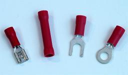 Wire connects and terminals will make connections between wires and terminals more secure and easy and less permanent. They come in varieties like quick disconnects that hold on terminals, butt connectors that link wires together, and spade (fork) and ring terminals that hold under screws. The metal faces share conductivity with the attached wire(s). They generally use crimping tools to attach to wires, but can also be attached using solder. Many of them are color-coded: red is 18-22 AWG, blue is 14-16 AWG, yellow is 10-12 AWG or 24-26 AWG.